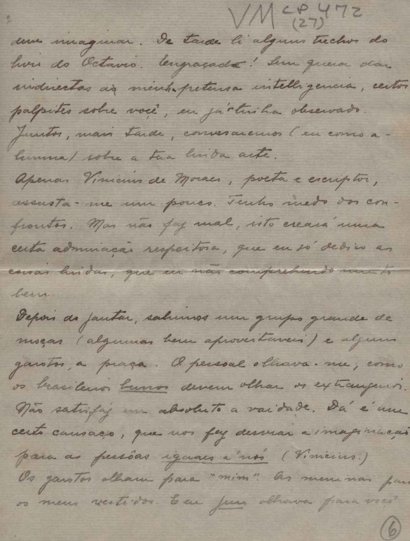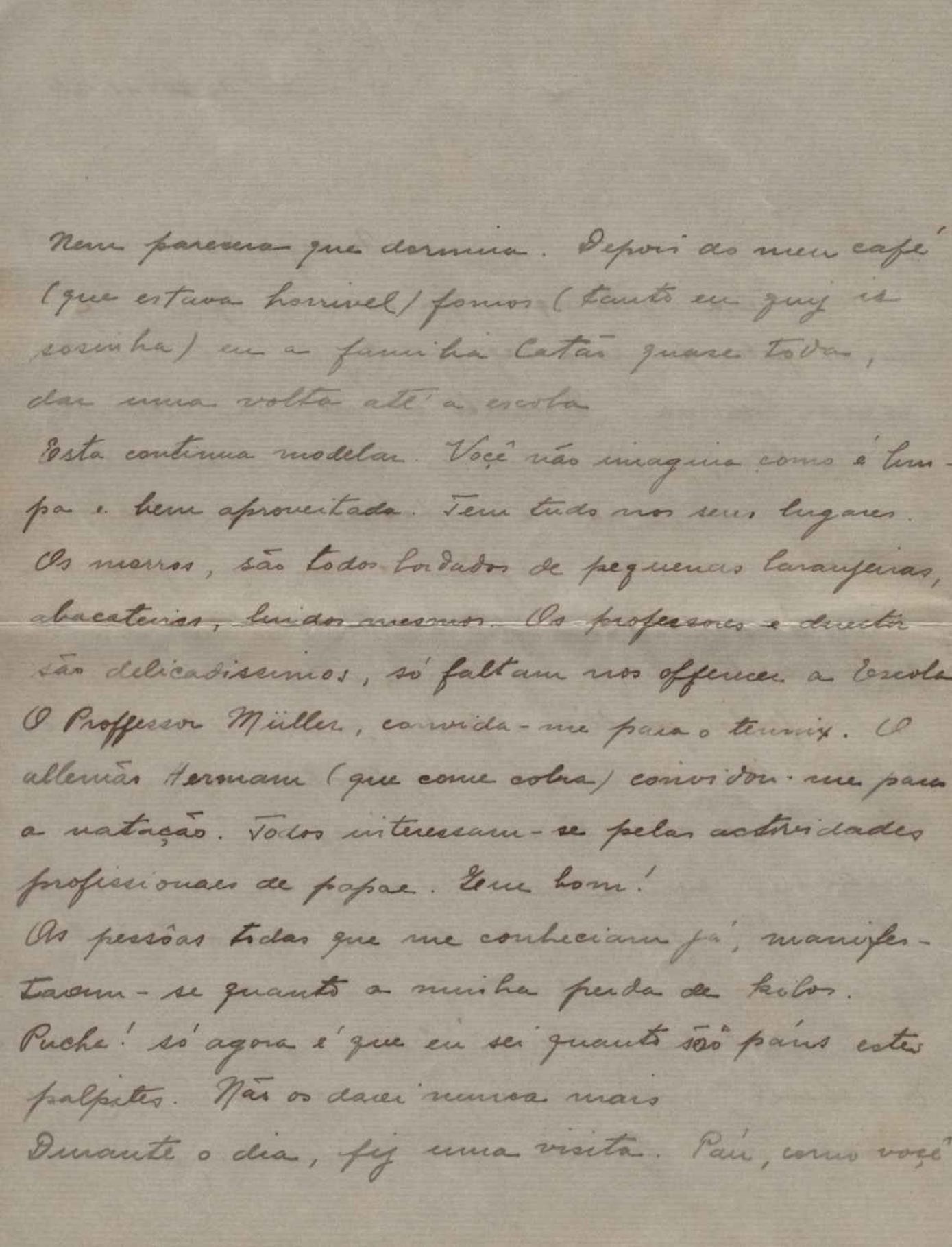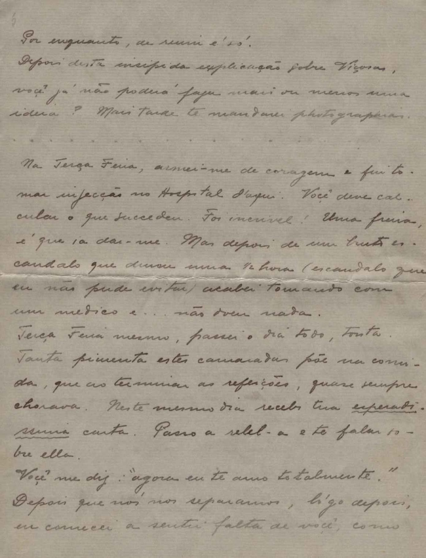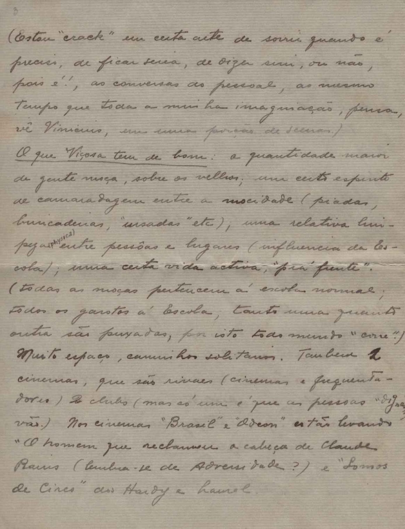 Relato da viagem de trem, do Rio para Viçosa, realizada pela signatária. Comentários sobre a cidade de Viçosa. Declaração de amor a VM e demonstração dos temores de perdê-lo. Manifestação de opinião sobre a postura dos amigos de VM quanto ao romance dos dois.