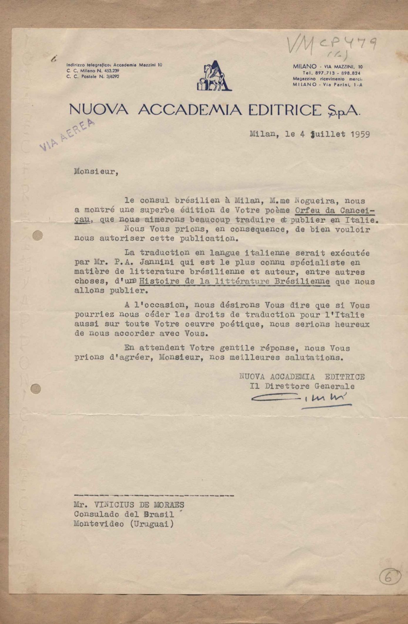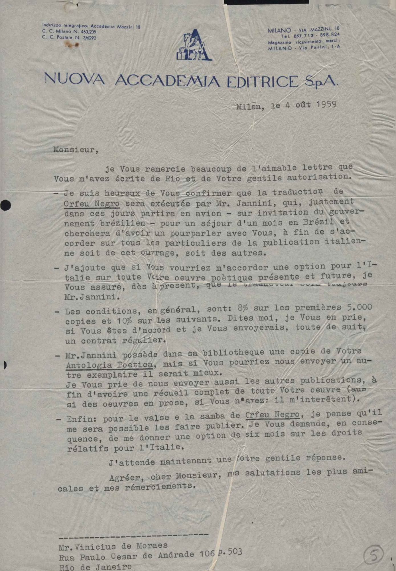 Tradução e publicação de Orfeu negro para o italiano. Pagamento de direitos autorais.