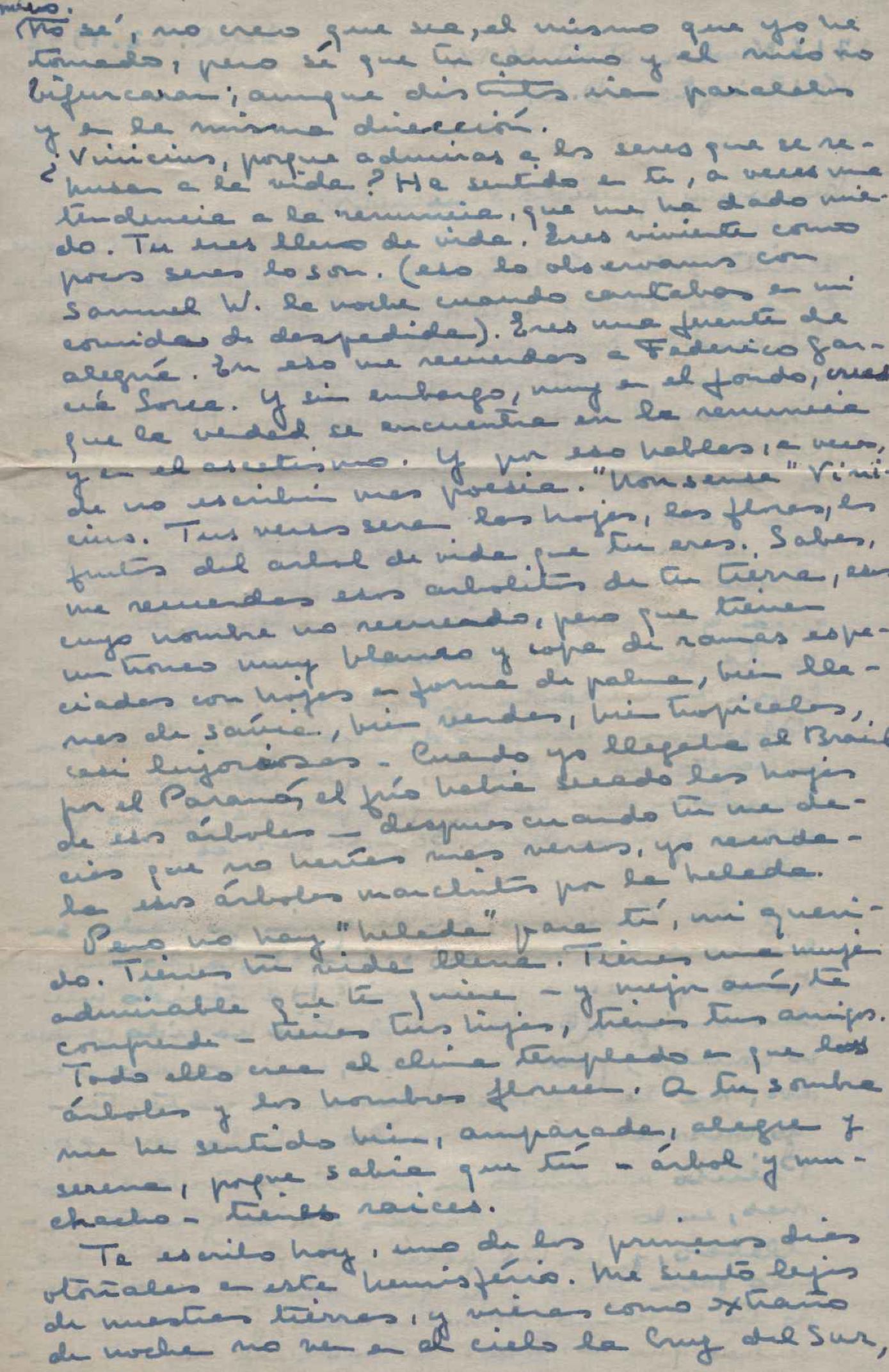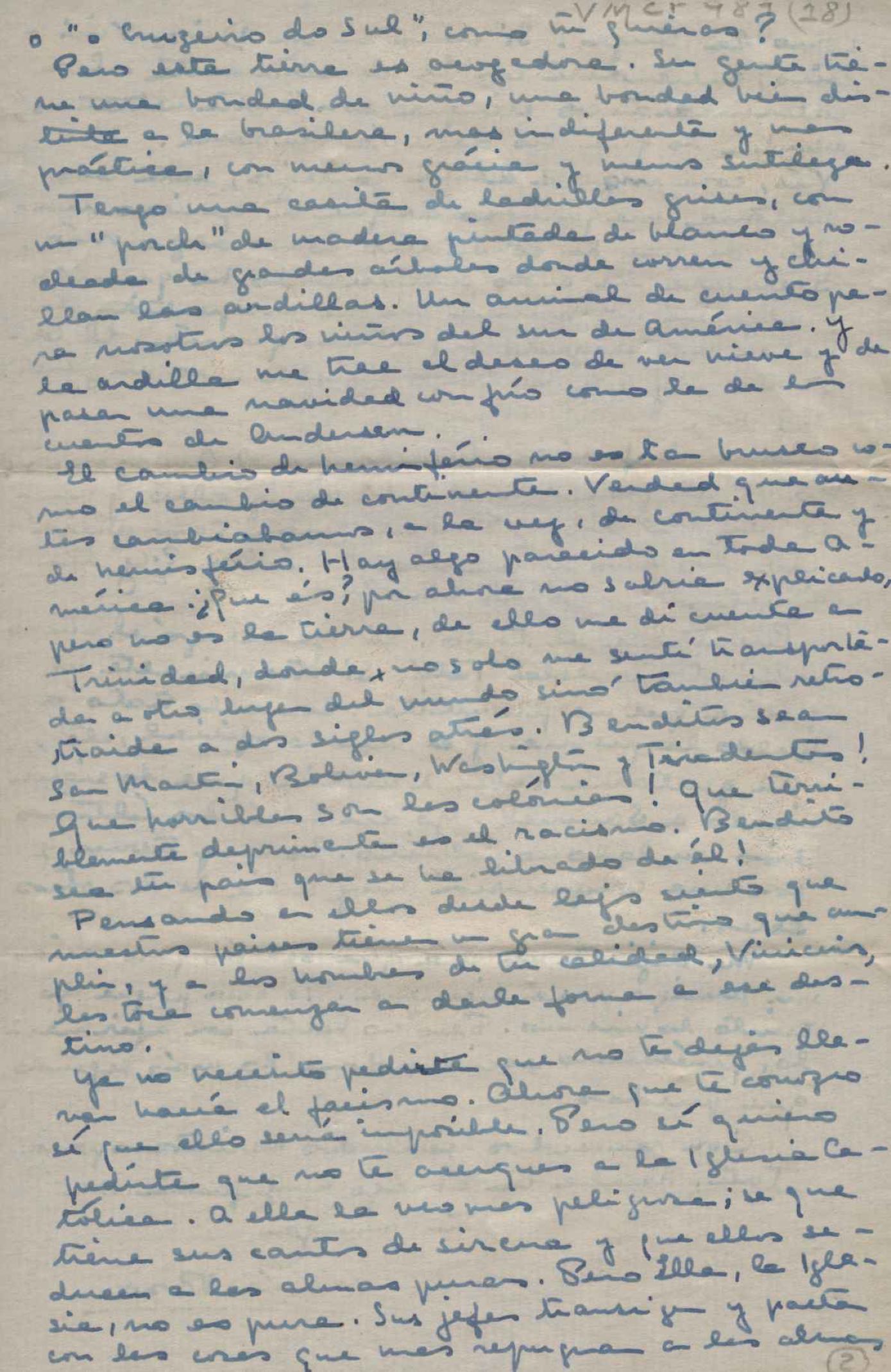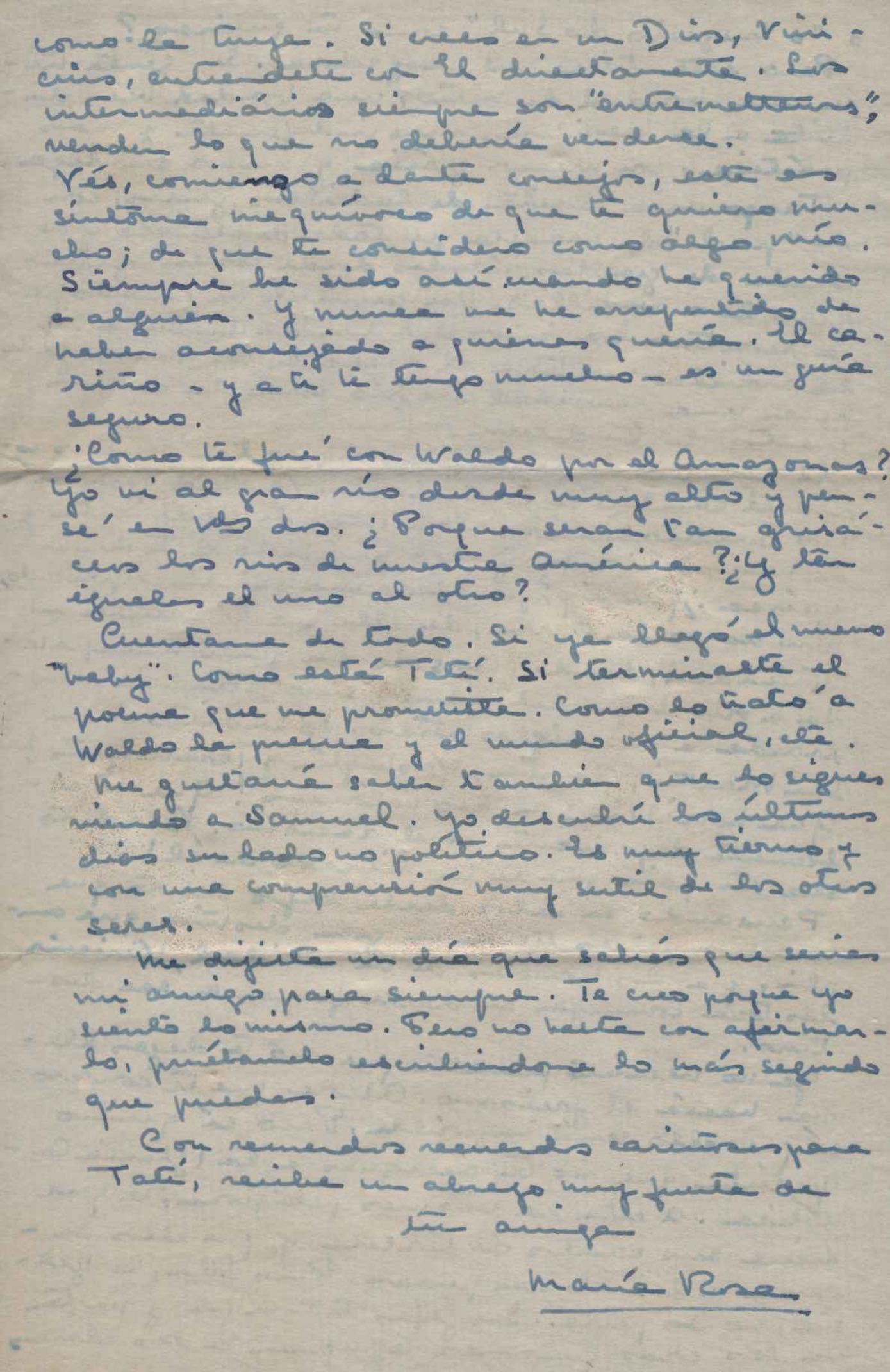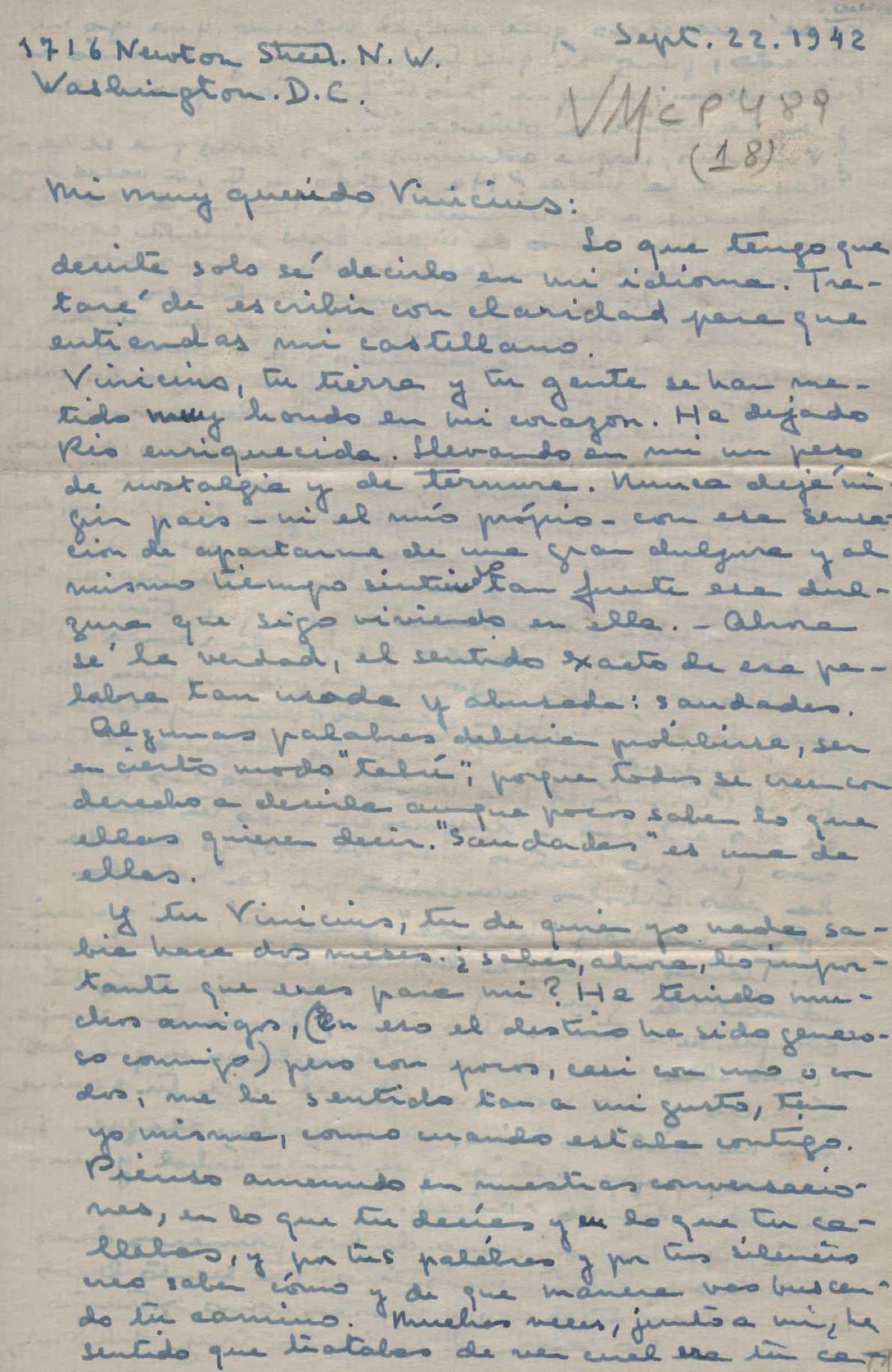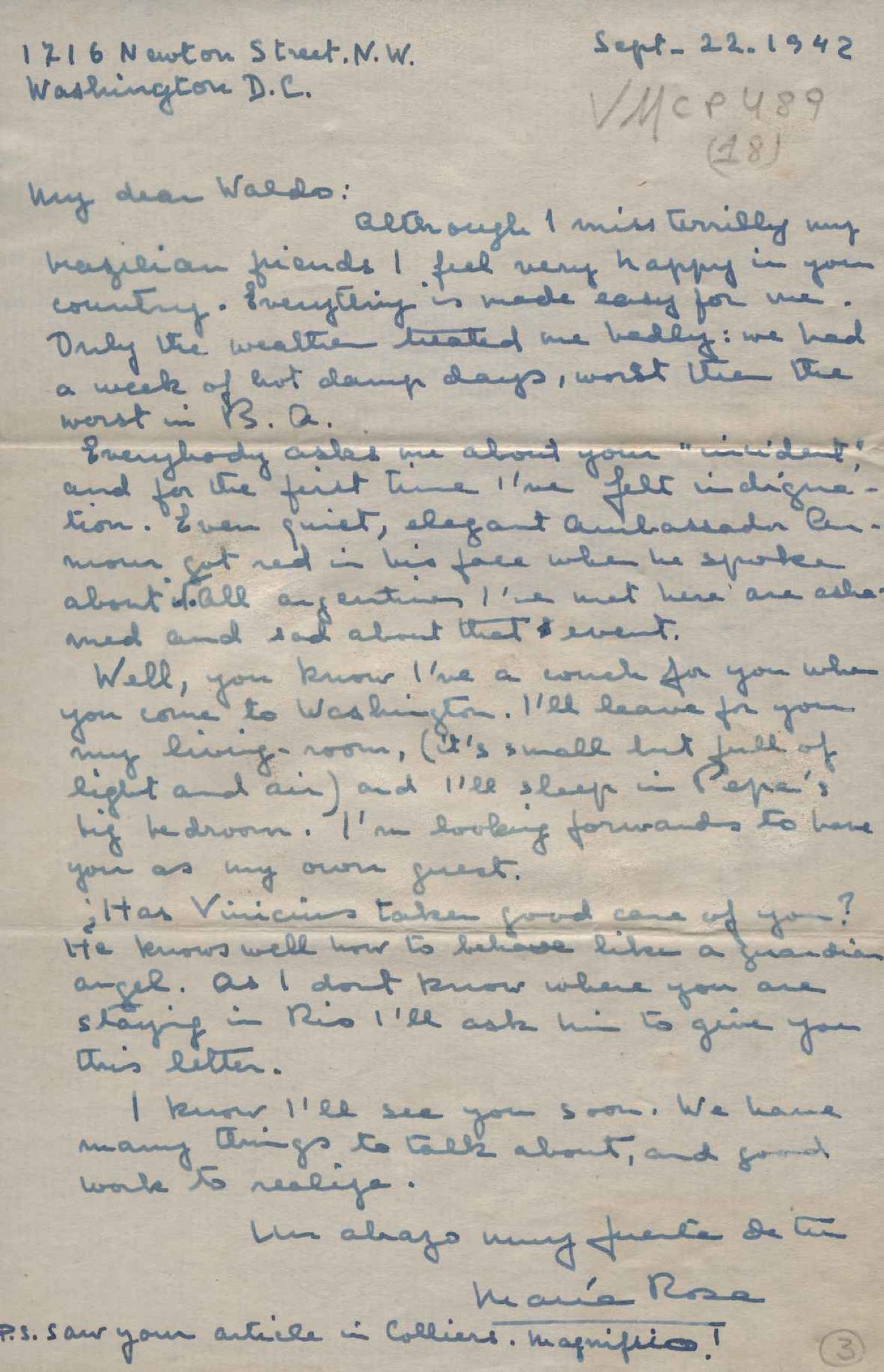 Manifestação de saudades e elogios ao Brasil. Reflexões sobre o continente americano. Pedido de notícias da viagem que VM realizou com Waldo Frank. Comentários sobre Varsóvia, pós-guerra, e sobre o Congresso para a Paz, realizado nessa cidade em 1943. Anexo: Carta de Maria Rosa Oliver a Waldo Frank.