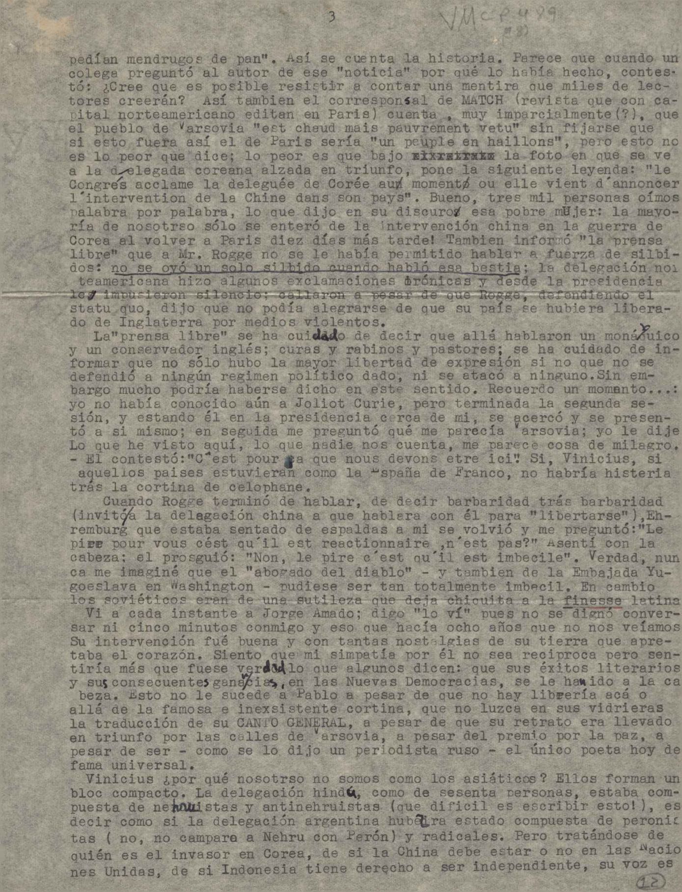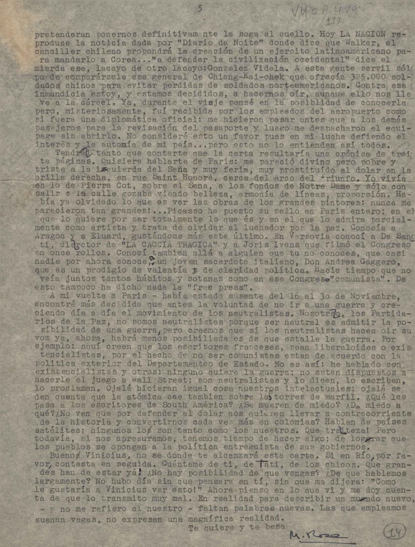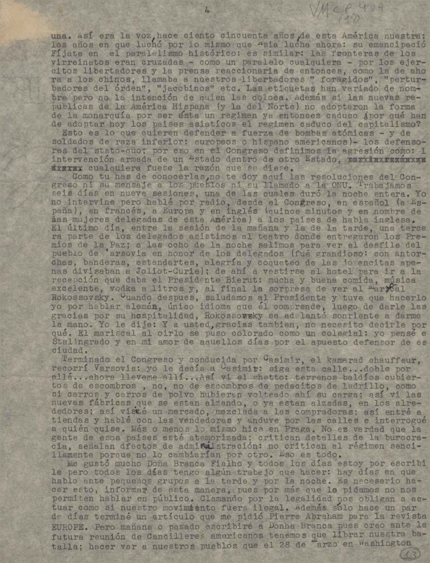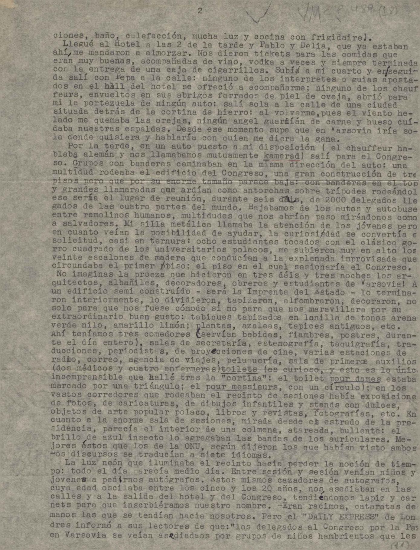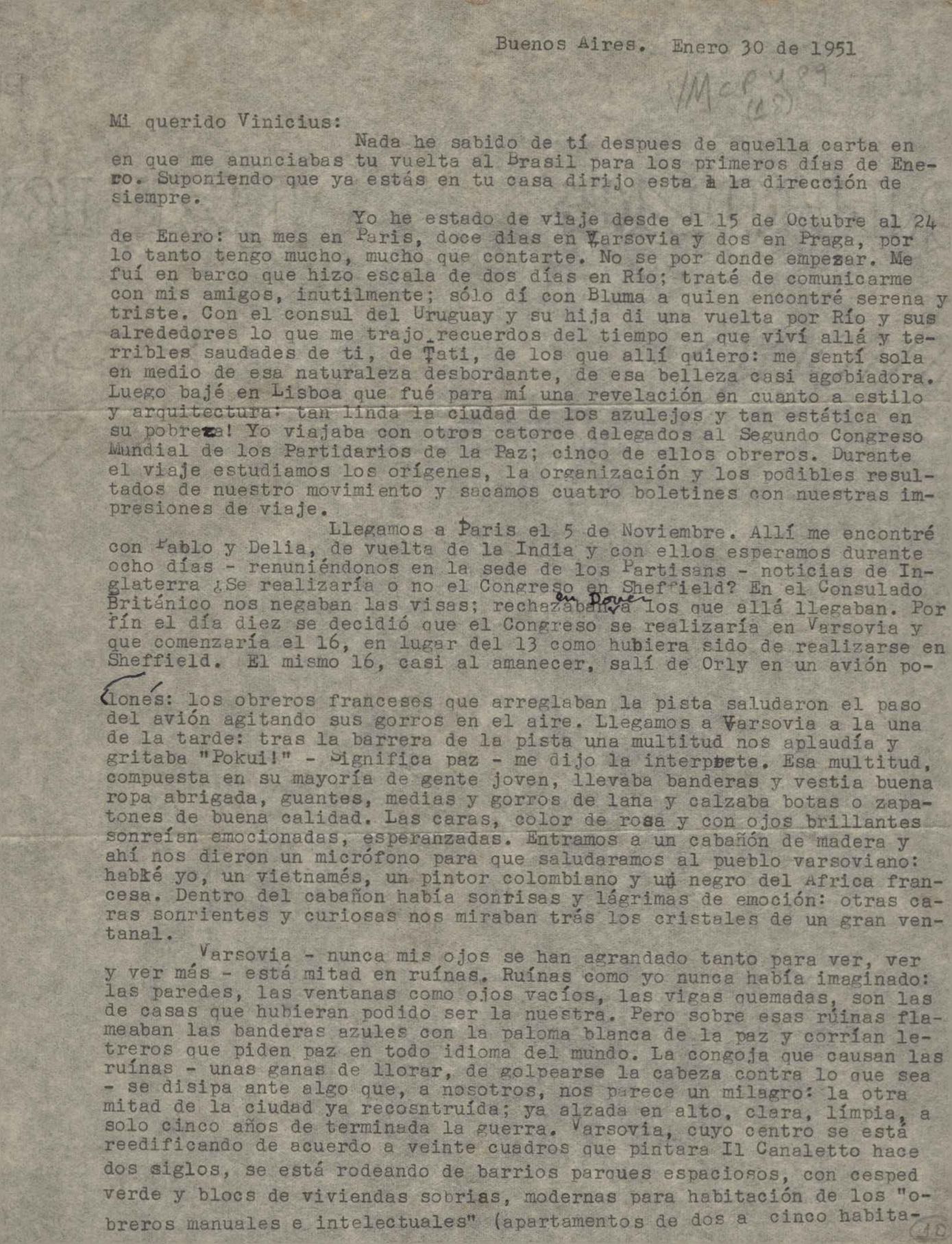 Manifestação de saudades e elogios ao Brasil. Reflexões sobre o continente americano. Pedido de notícias da viagem que VM realizou com Waldo Frank. Comentários sobre Varsóvia, pós-guerra, e sobre o Congresso para a Paz, realizado nessa cidade em 1943. Anexo: Carta de Maria Rosa Oliver a Waldo Frank.