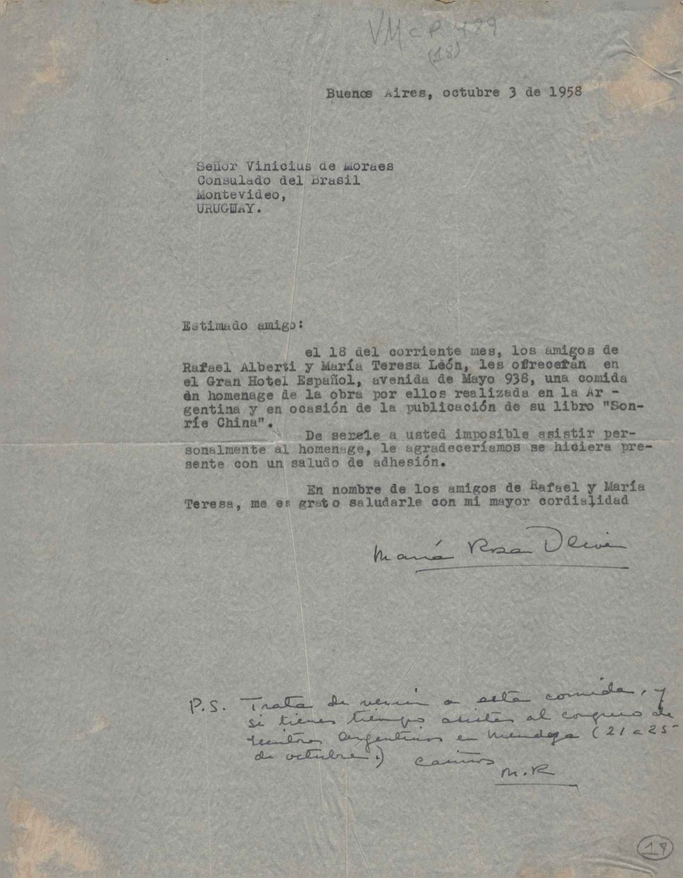Manifestação de saudades e elogios ao Brasil. Reflexões sobre o continente americano. Pedido de notícias da viagem que VM realizou com Waldo Frank. Comentários sobre Varsóvia, pós-guerra, e sobre o Congresso para a Paz, realizado nessa cidade em 1943. Anexo: Carta de Maria Rosa Oliver a Waldo Frank.